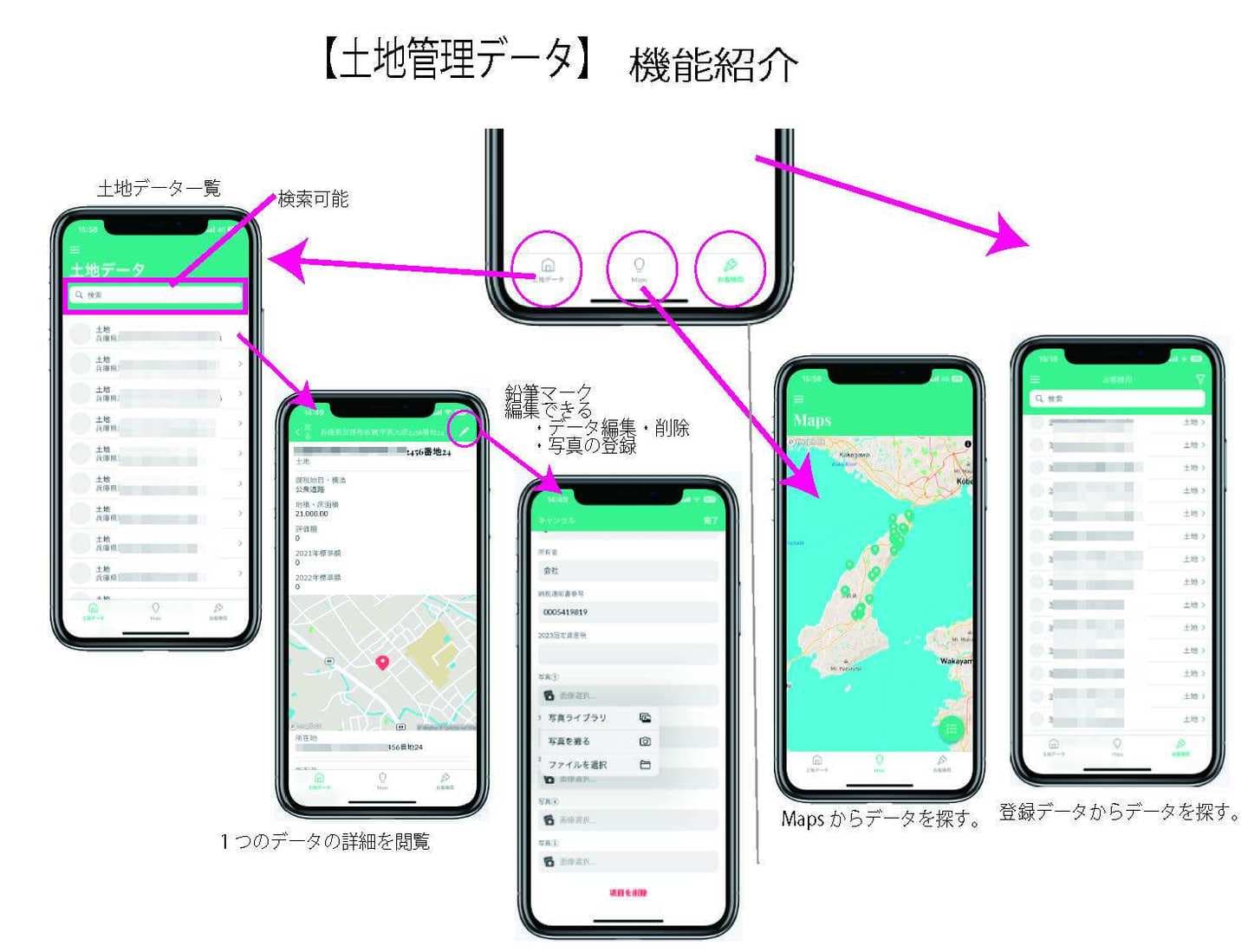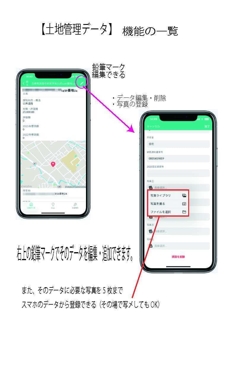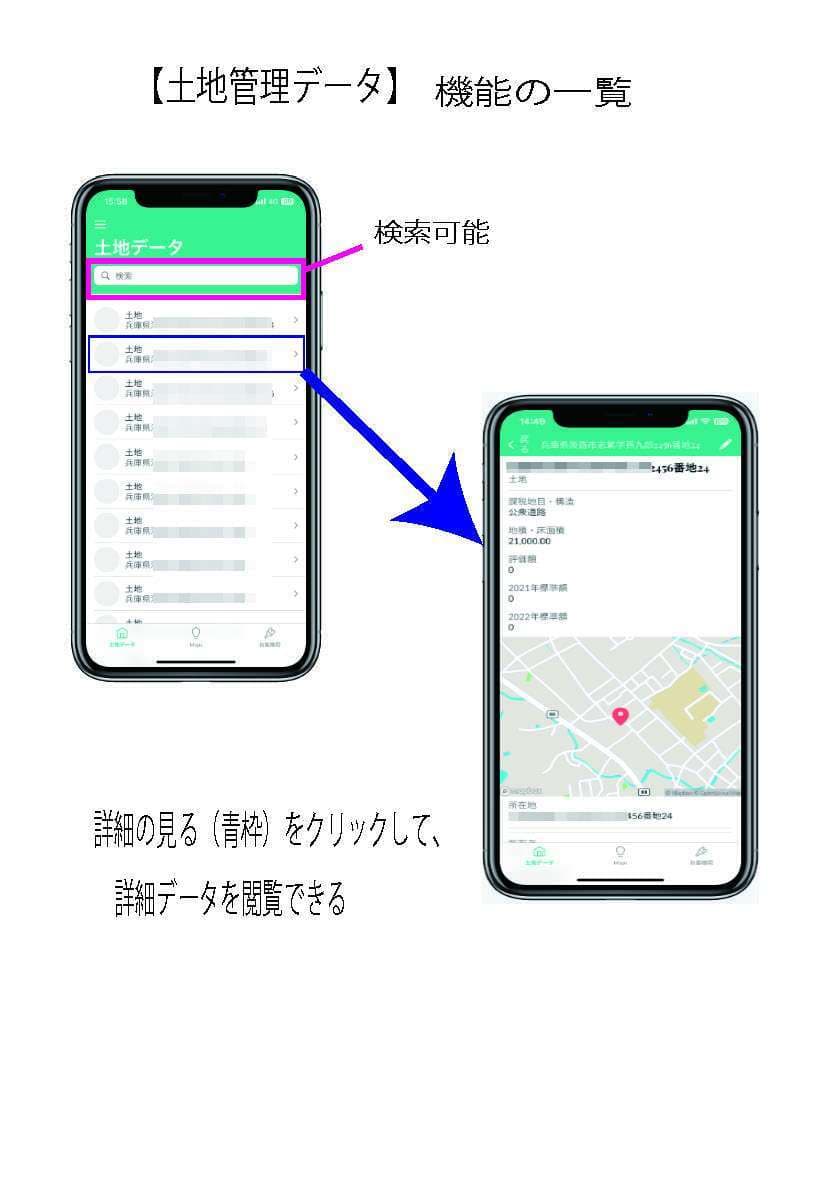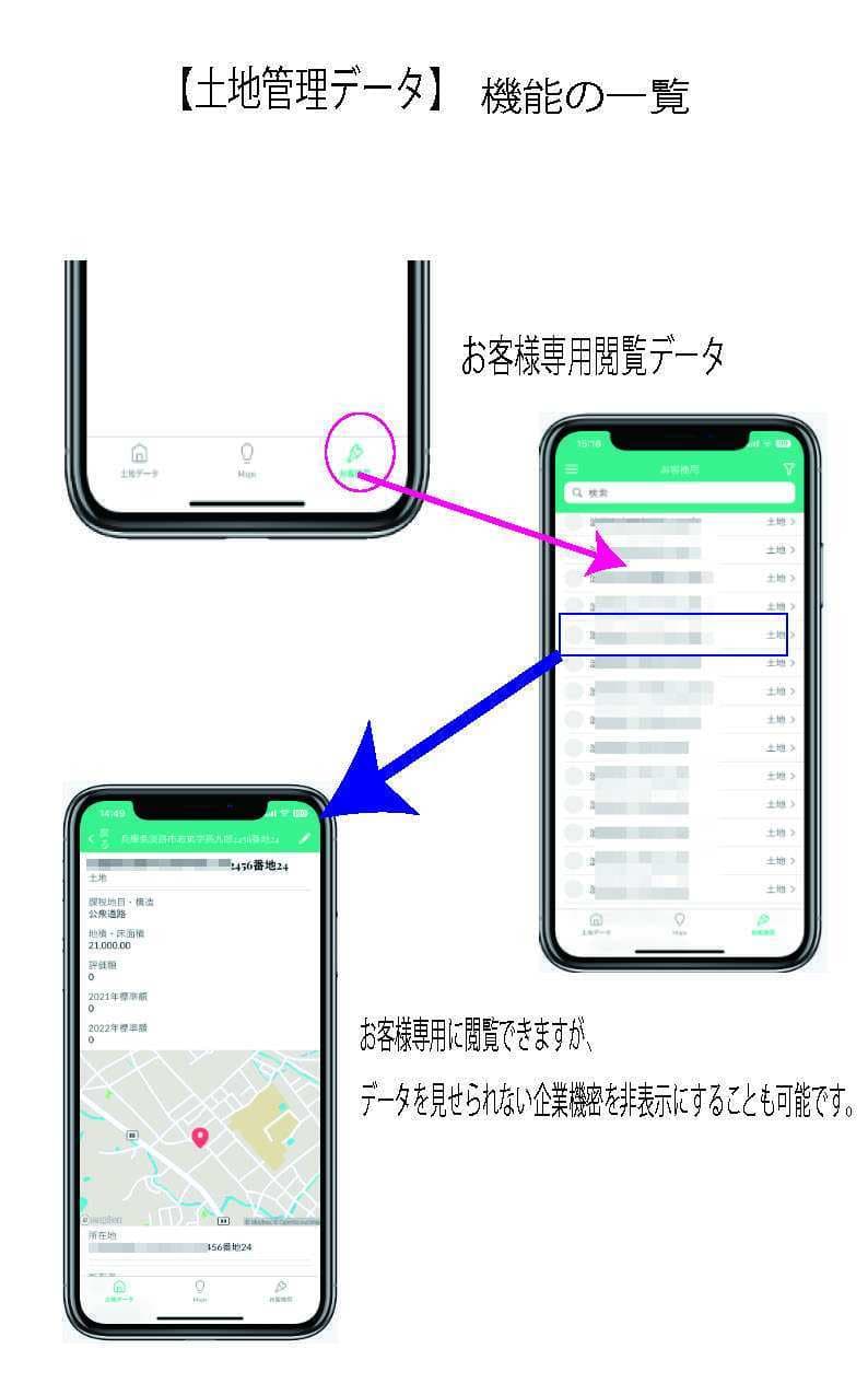 固定資産の情報をデータ管理するシステムで、土地・家屋情報管理するWEBアプリです。お客様に閲覧できるデータには、非公開データを表示させます。スマホ&iPadで閲覧編集できますので、現地でその場の生きた情報の写真をアップでき、修正もできます。
